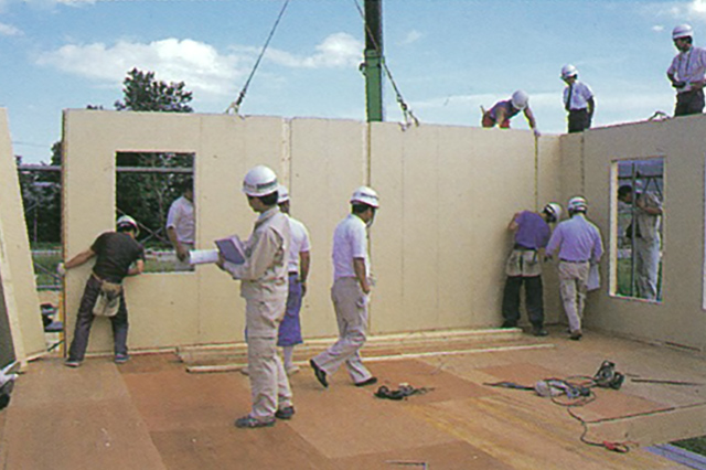 断熱施工を工場で行い、精度の高い壁や床を現場で組み立てる「パネル化」の検討を1985年に開始しました。既に柱や梁のプレカット化、室内間仕切り壁のパネル化は実用化していましたので、外壁や床の断熱パネルにもそれを応用する発想でした。