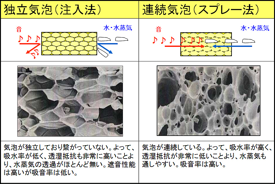 断熱材内部の気泡構造。左がFPパネル(独立気泡)で、気泡が独立しているため、