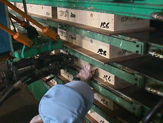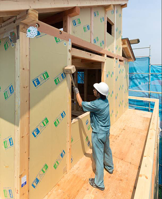 こうして完成したFPパネルは、803×2850ミリのパネル一枚が約20キロほどの重量があります。このFPパネルを住宅建設現場に搬入し、大工が大きな木づちで上下左右に隙間が無くなるように柱梁にはめ込みます。