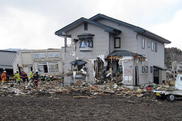 左の写真は東日本大震災で津波に耐え、流木によって壁が壊された「FPの家」です。