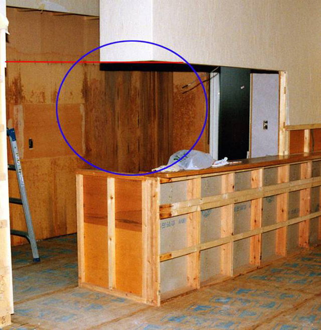 2003年高知大水害で床上2メートルまで泥水に浸かったモデルハウス。災害後に内装仕上げを剥がすと下地が濡れていました。