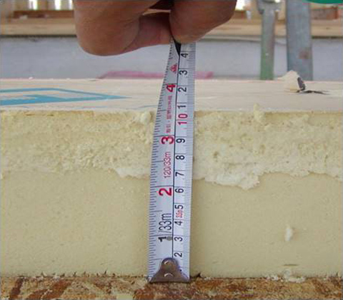 現場でウレタンを吹き付ける方法では、厚みにムラができ、薄いと断熱性能が不十分、厚すぎると表面のスキン層(発泡プラスチックを成型する際に発生する、部材表面の密度の高い層のこと)をカットしなければなりません。あるいはウレタンパネルを工場生産する場合でも、一度大きく製造してからカットする方式だとスキン層を切断することになります。