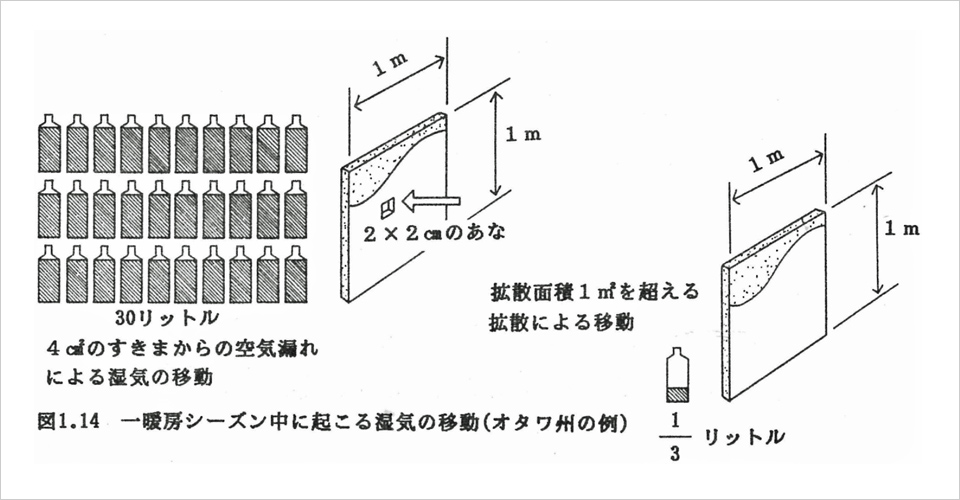オイルショックを契機に、カナダ政府が開発を進めた、エネルギーを節約し高い居住環境を実現するツーバイフォー住宅「R-2000住宅」の施工マニュアルにも住宅内の湿気移動の仕組みが詳述されています