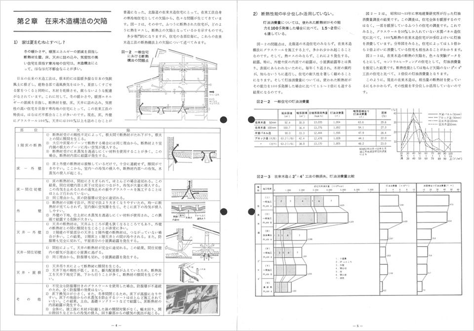 住宅業界の専門紙・北海道住宅新聞社が、昭和59年、住宅会社向けに行った住宅セミナーの資料より。断熱材を厚くするだけでは断熱性能が発揮できない、壁内結露による木材の腐朽が進む点などを解説